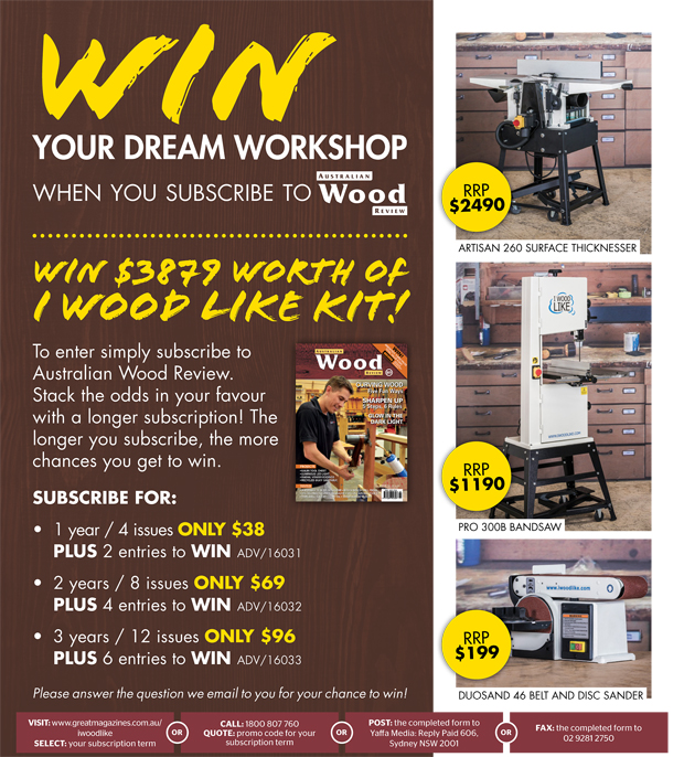 Close× Need Some Machinery? 3 April 2016 Comments Comments Head to www.greatmagazines.com.au/iwoodlike OR call 1800 807 760 for this great offer! Note: You can only get the discounted subscription rate and save off the newsstand price by using the link above or phoning direct. Please enable JavaScript to view the comments powered by Disqus. comments powered by Disqus