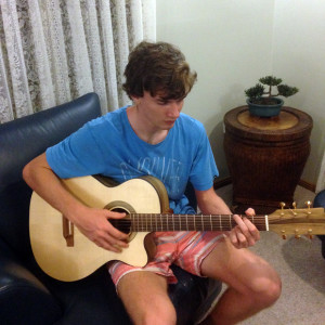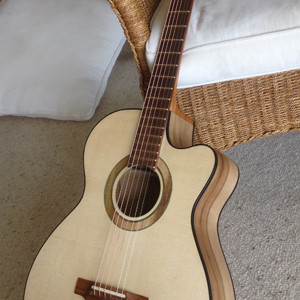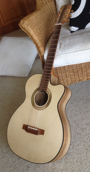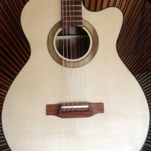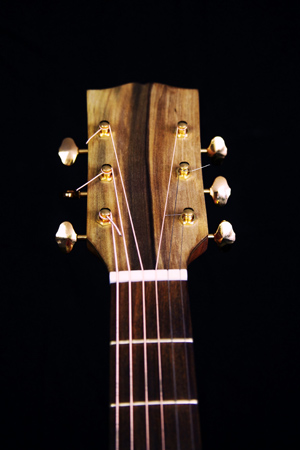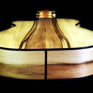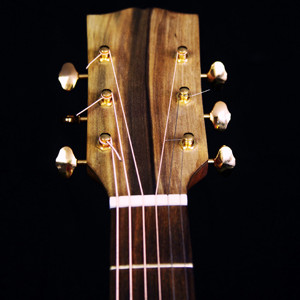 This guitar sports six steel strings to create a great guitar tone, with optimal levels of treble and bass. I wanted it to be lightweight, and in a traditional shape that allows me to play notes that are closer to the soundboard easily. I also wanted to use a timber with a high contrast in colour for the back and sides, due to its grain texture, over which I applied a gloss finish. It has distinctive features along the neck with different patterns. It also has complimentary patterns on the rosette and bindings to add extra appeal to the guitar.