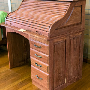 My roll top desk was constructed using various construction methods which included using slabs of Mackay cedar, domino jointer, biscuiting jointing, routing, tambour construction, dovetailing and finger jointing, panelling, sanding, thicknessing and jointing, lathe turning (pen making), and polyurethane spray finish.