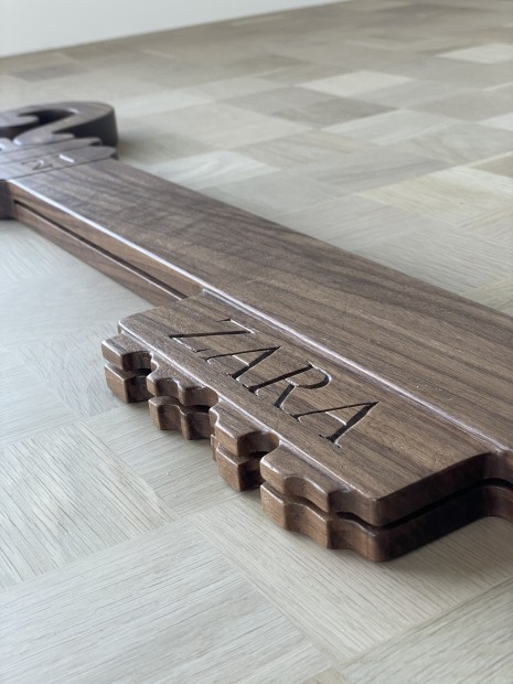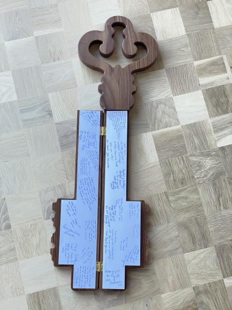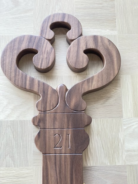American walnut 21st key for my daughter, with a flap for guests to write birthday messages. It will be hung on her wall as a keepsake and souvenir of the day.