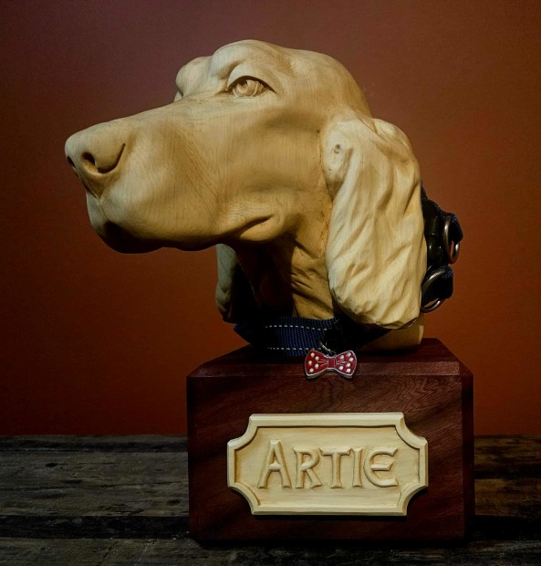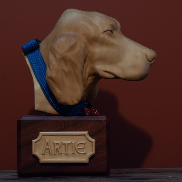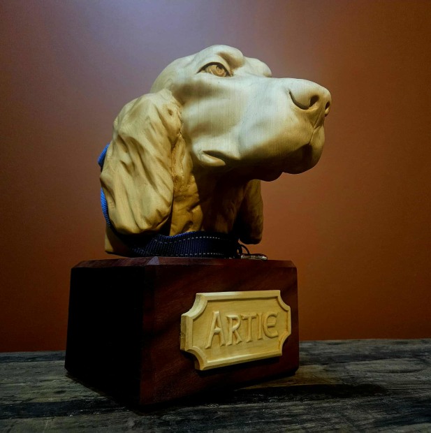 He wasn't just my chief offcut chewer, safety officer, and workshop manager. He was my best mate. In memory of Artie Farty Medwell 8/7/2020-13/11/2024 And for all the shop dogs out there. Chew offcuts, not finished pieces. Keep woofing! Artie's was carved unplugged in huon pine. Bulked out with handsaw, axe, adze, veritas drawknife, and pfeil gouges. Detailed with pfeil hand and palm gouges. Scraped with pax mini scrapers and sanded. The base is rose mahogany. Drawknifed and scraped. Name plate huon, carved with pfeil palm gouges. Finsihed with oil/wax.