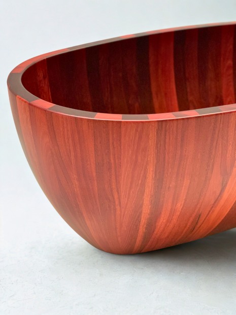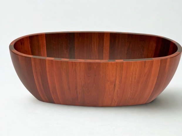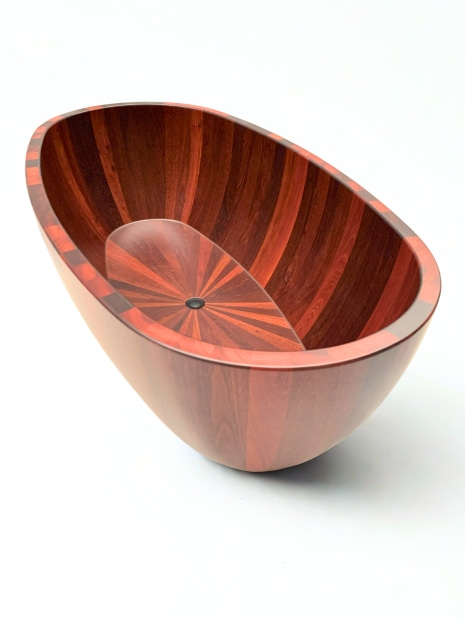 This bathtub is handcrafted from Jarrah timber, valued for its deep red tones and strength. Built with coopered staves in a barrel-inspired form, the oval design highlights precision joinery and a radiating sunburst pattern across the base. The smooth, polished finish enhances the timber’s natural richness, creating a piece that is both functional and sculptural.