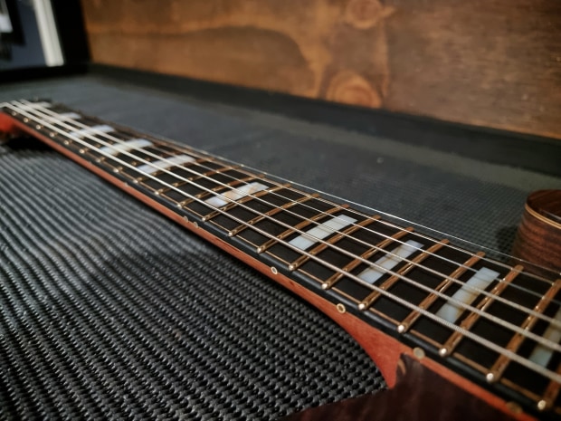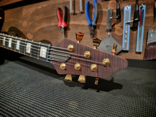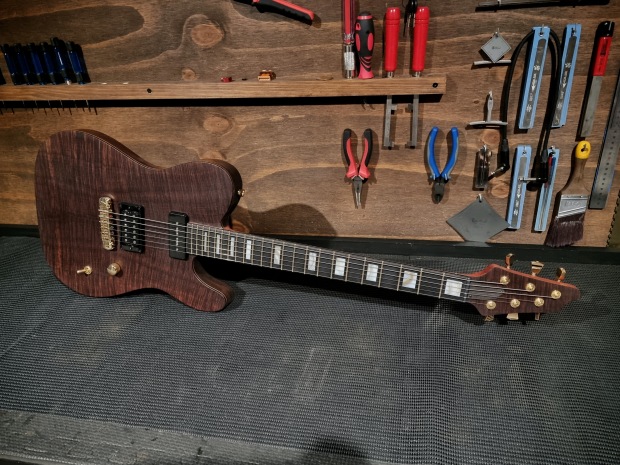 BB Guitars Custom Electric T-Style guitar. This guitar made from a range of Australian timbers was built with all aspects of its design made to compliment and champion the highly figure Ringed Gidgee top. Timbers used in the build are Ringed Gidgee, Tasmanian Blackwood, Spotted Gum and Sydney Bluegum, using multi laminate construction for both the body and set neck. The fretboard is detailed with hand cut and hand inlaid Brown Muscle shell blocks, veneer purfling and side markers made with brass tubing inlaid with more Brown Muscle shell.
