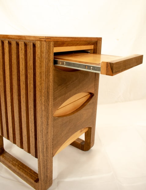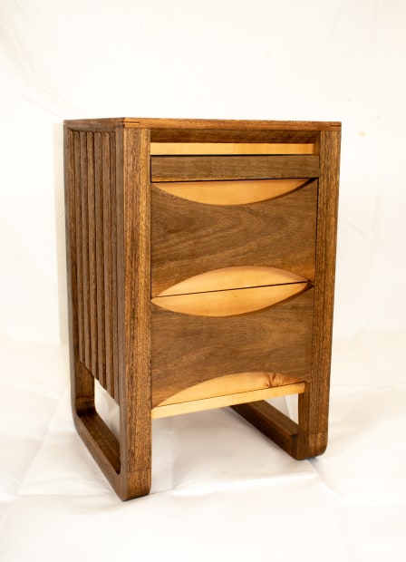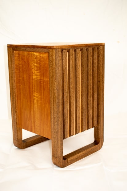 Bedside table made with Spotted Gum and NZ Beech with a Tasmanian Blackwood veneered back and Redgum accent pieces.