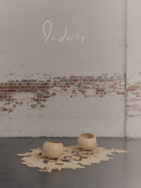 These bowls are made from jelutong timber off cuts, built using a bricklayer pattern and turned into 400 mm spheres on the lathe. The sawdust produced from machining and turning the bowls was collected and treated into a composite material that was then moulded into bricks. Some of the bricks were dyed using eucalyptus leaves. The bricks can be disposed of organically.