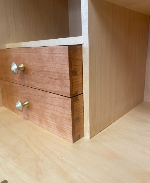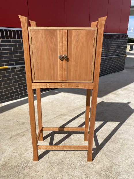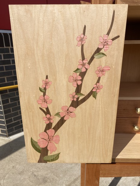 This cabinet is a showcase of fine craftsmanship, blending function with artistry. The main body is fully veneered in American Cherry and Rock Maple, highlighting the natural contrast of timbers. Hand-cut dovetail joinery features in the drawers, ensuring strength and precision. The interior layout offers versatile compartments, balanced with smooth brass-knobbed drawers. The inside of the doors displays original floral marquetry, carefully designed, crafted, and placed by hand. Subtle etched burns form delicate pollen details within the blossoms, adding depth and finesse. Standing tall on long, elegant American Cherry legs, taking after the Krenov Cabinet Style, the cabinet shows a unique style to woodworking away from standard cabinet designs.