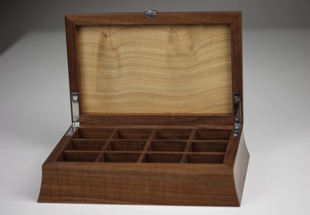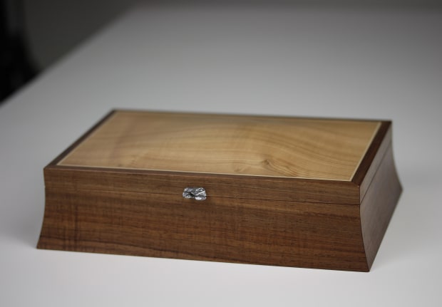 Cufflink box in fiddleback blackwood with a compojnd curved musk top. Cheesewood inlay and handcarved meteorite opening tab. Soft leather base with a press fit easily removable interior divider.