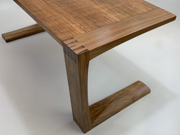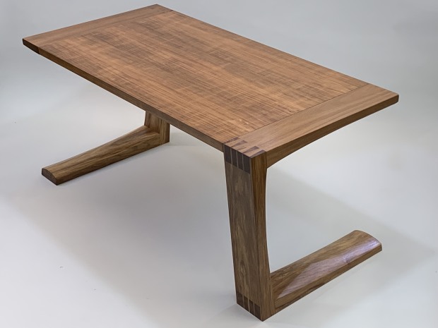 This desk was made and designed as a custom order for a client. My client wanted a desk without front and back, that could be seen identical from both sides. I combined both solid and shop sawn veneer of Incienso Wood, a very hard and dense Argentinian wood. The solid legs have big hand cut dovetails and the veneered central Part has a solid core in Quarter sawn Ajous wood. Finished with wipe on and off varnish. 160x80 cm