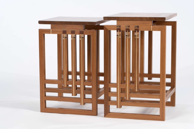 When designing this pair of nesting tables, my goal was to create pieces that could function both together and independently. Each table is equally refined on its own, yet they form a harmonious ensemble when stacked. Their symmetry invites playful arrangements, allowing the user to experiment with different configurations. The design draws inspiration from Art Deco and Modernist aesthetics, featuring brass accents and end-grain wood mosaic made from salvaged pieces, which add both richness and sustainability to the work.