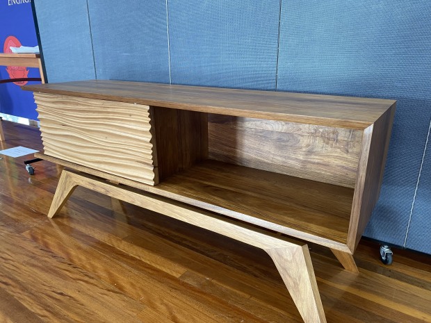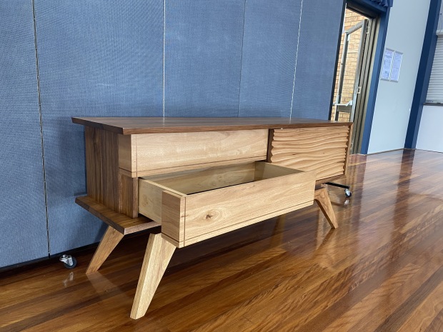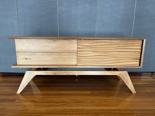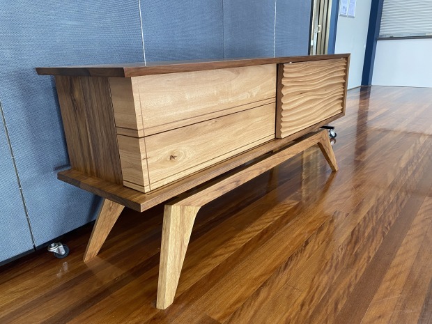 Bespoke low lying entertainment unit crafted from Tasmanian Blackwood and Coastal Bluckbutt. Mitred wrap around drawers fronts with machine cut dovetail drawers and a CNC machined wave sliding door incorporating hand made rollers and guides. Finished in a satin polyurethane spray finish.