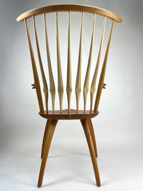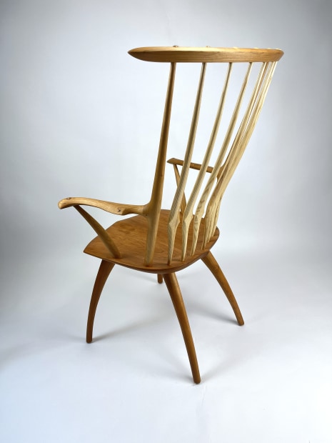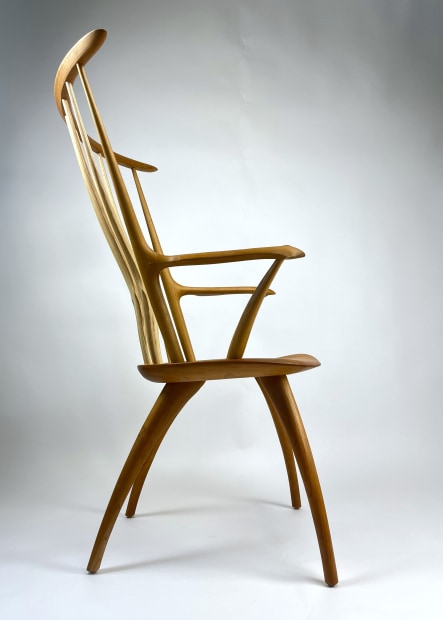 I believe a chair is the most intimate piece of furniture. Unlike a bookcase or table, a chair is in constant contact with your body. Its proportions mirror your own, offering support, comfort, and welcome. The "Eva" armchair is rooted in the Windsor tradition, with a solid wood seat joined to all other elements, but I use this form as a framework for exploration rather than reproduction. I pursue flowing lines, visual tension, and sculpted details. Flexible steam bent spindles provide support, while an innovative aluminum plate construction allows me to eliminate stretchers and refine the leg to seat transition. Every detail is intentional, from rounded spindle ends that invite touch to carved textures beneath the handholds. By blending traditional handwork with modern engineering, I aim to honor the history of chairmaking while pushing it forward, creating chairs that are not only functional seating, but objects of connection. The "Eva" chair is made from black cherry and ash wood, aluminum and steel. It's finished with hard oil wax