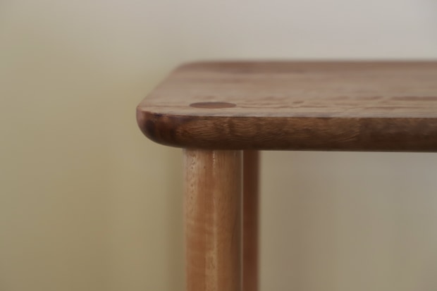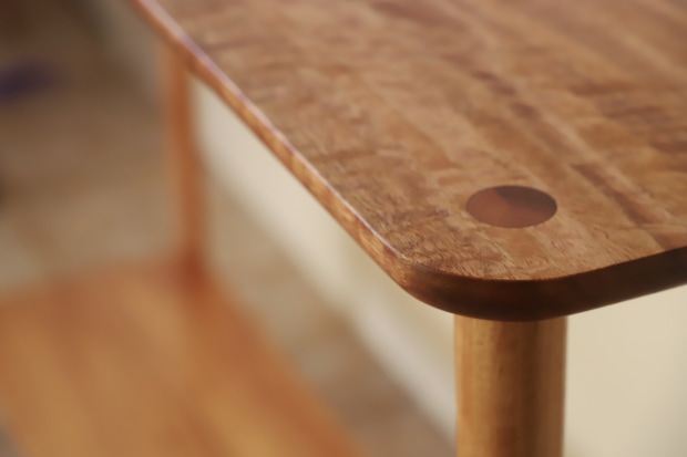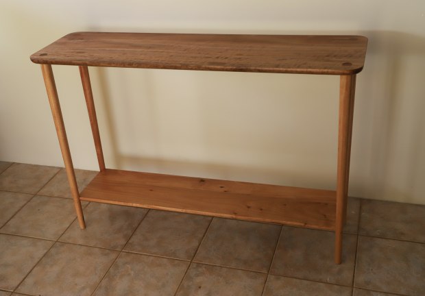 This piece came about whilst trying to work out how best to use a narrow, blackbutt slab off cut, that was barely bigger than it’s finished size, and too good to cut up because of its figure. The legs and shelf are also blackbutt, which was salvaged from a firewood pile, and thought to be ‘probably jarrah’. The through dowels for the shelf were made from what little offcuts were left. The piece features a number of natural defects, owing to the nature of the weathered, reclaimed material, which have been left in tact for the most part, celebrating where it came from, and avoiding excessive waste. The design has been kept minimal and uncomplicated, in an effort to best showcase the figure and features of the timber used, in a refined and subtle form. It is simply finished with an all natural tung and citrus oil blend, retaining the feel and character of the material. Dimensions: 1200L, 350W, 800H The legs and shelf are also blackbutt, which was salvaged from a firewood pile, and thought to be ‘probably jarrah’. The through dowels for the shelf were made from what little offcuts were left. The piece features a number of natural defects, owing to the nature of the weathered, reclaimed material, which have been left as is for the most part, celebrating where it came from, and avoiding excessive waste. The design has been kept minimal and uncomplicated, in an effort to best showcase the figure and features of the timber used, in a refined and subtle form. It is simply finished with an all natural tung and citrus oil blend, retaining the feel and character of the timber.