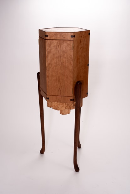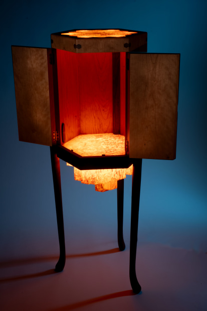 Hexagonal liquor cabinet utilizing glowing veneers. Inspired by honeycombs and basalt columns.