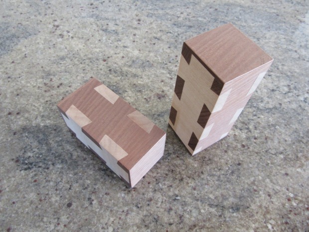 These two whatnots sit on our coffee table. Visitors inevitably stare at them, wondering what they are. Practical types always pick them up and ponder how they are made and assembled - this consumes much of their time. These whatnots are made from recycled Northern Rata (NZ) and Silky Oak (Aust) timber. They each took me over a day to make, requiring incredible accuracy and very sharp tools.