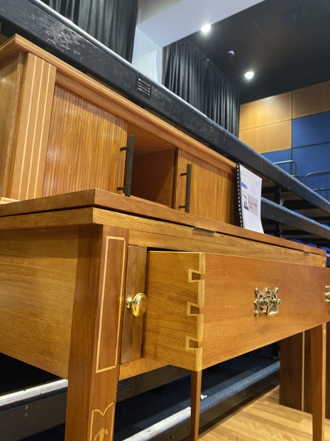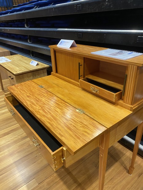For my 2025 HSC Major Project I chose to Construct a Federal-Style desk. The desk will be used for a study area for me and my family as well as being a feature pieces in my house. The main focal points of the table include the bellflower inlays on the taper legs, A hidden drawer area that is revealed 2 tambour door and beautiful dovetail inlays that contrast the colours of my timber. I constructed the desk from solid Mahogany and stunning rock maple. I employed a vast array of timber joinery techniques and process that have been executed to the upmost quality. These include dovetail joints, Hand curved inlays, taper legs and Tambour doors, all joints where hand cut and the inlays on the legs where made by using chisels in a slow long process. I chose to apply a stunning French Polish that highlighted the beautiful grain patter, texture and colour of Mahogany.