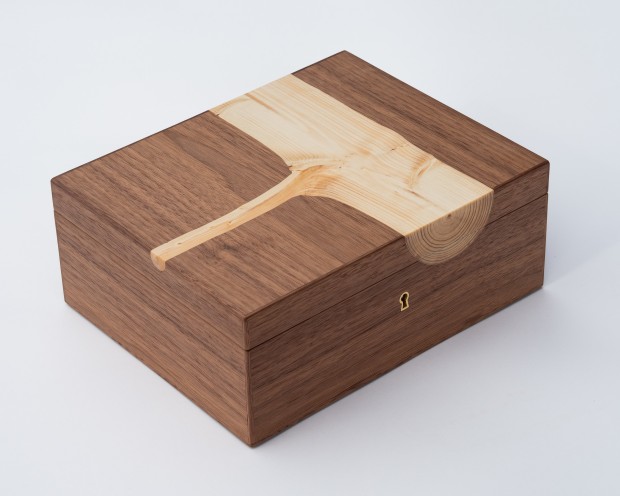 A walnut keepsake box featuring an inlay of Sitka spruce. The interior is white oak with a small tray of macadamia nut wood. The box is constructed using shop-sawn veneers on shop-made lumber-core substrate. H 3 7/8" W 9 7/8" D 7 7/8" @laelgordonfurniture