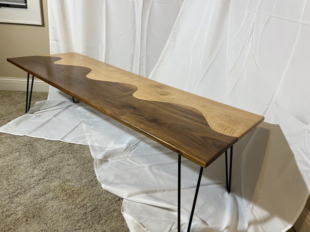 This coffee table was influenced by the whole Yin&Yang concept while using Walnut(darker wood) with Curly Maple(lighter wood). This piece was mostly done with hand tools except the very beginning cut. It took many variations of the curve before I finally settled on it.