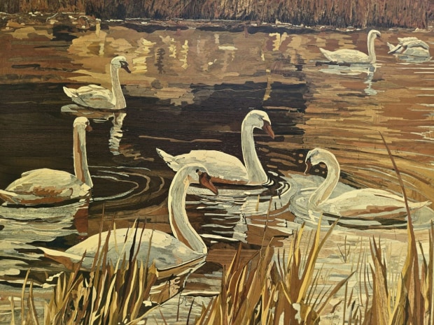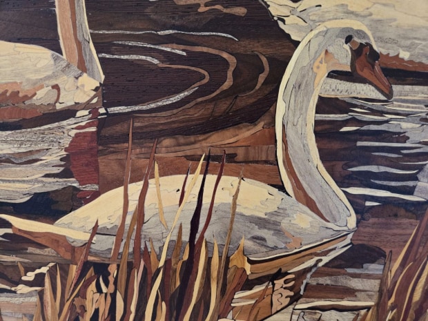 This marquetry artwork, Melody of Serenity, (Dimensions: 77 × 76 cm) is crafted entirely from natural solid woods, each with a thickness of about 4–5 millimeters. No veneer, dyes, or artificial coloring were used — every tone and texture reflects the true character of the wood itself. The piece is composed of thousands of individually cut fragments, meticulously shaped and assembled over the course of several months. Using both a hand fret saw and a Carbotech scroll saw, each detail was carved with precision. To complete the work, the surface was polished multiple times, creating a smooth, refined finish that highlights the natural depth and warmth of the woods. The woods chosen include walnut, cherry, maple, ash, acacia, eucalyptus, and others — each bringing its own natural grain and color to the composition. Together, they form a harmonious palette that gives life to the artwork. Beyond its technical execution, this artwork holds a deeper meaning. The swans, gliding gracefully together across the water, embody serenity, unity, and the harmony of family. Just as each tiny wooden piece finds its place in the whole, the swans reflect the beauty of togetherness and the resilience found in love and connection. Please check following: Website: https://marquetry.com.au/ YouTube: https://www.youtube.com/@marquetry7 Insta: @artworksserenity