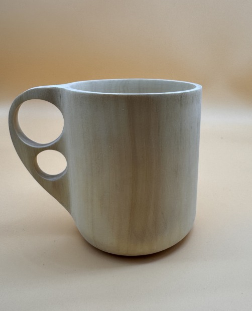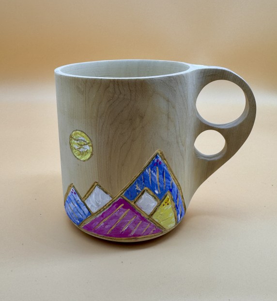 Hand-turned Huon Pine mug with carved and painted mountain motifs in vibrant colours, crowned by a golden sun. Both playful and meditative, this piece by Catherine Gorrie transforms a daily ritual into a reminder of renewal and connection with the natural world.