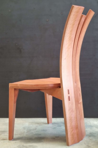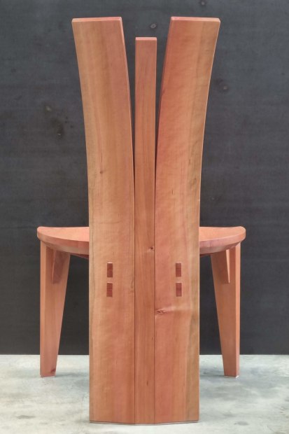 Split back dining chair in Tasmanian Myrtle with sliding dovetail joinery and steam bent backrest.