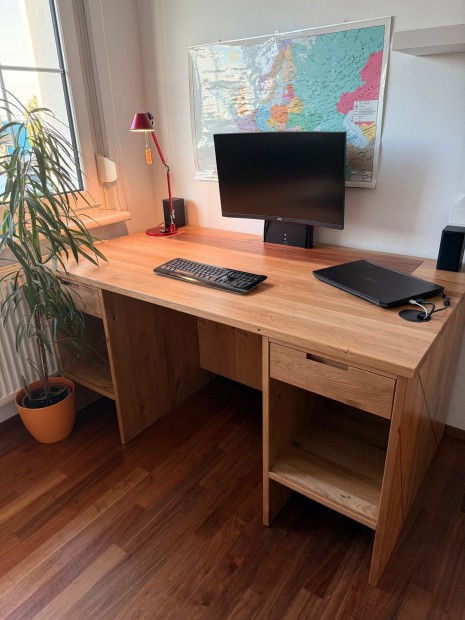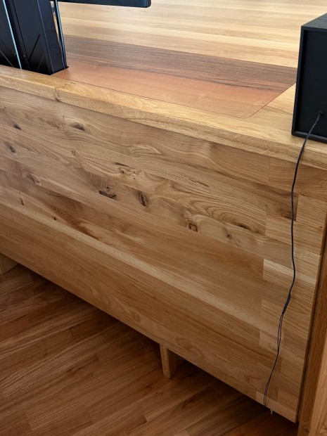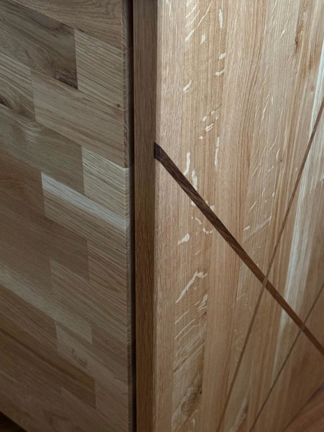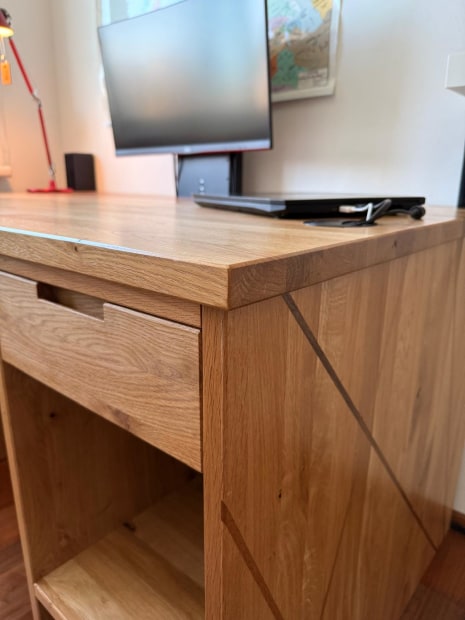 Creating “Open Sesame” had long been a dream of mine. I wanted to design a substantial desk and computer workstation that would impress not only with its generous dimensions and broad surfaces, but also with its thoughtful refinements. Despite its scale and solid construction, “Open Sesame” was envisioned to embody elegance and a sense of lightness. Side inlays break up the otherwise uniform expanses and bring visual variety, while the walnut accents set into the oak tabletop add another layer of contrast and sophistication. Because the desk was also conceived as a computer workstation, a monitor lift was essential to me—allowing the screen to vanish seamlessly into the tabletop when not in use and reappear at the touch of a button whenever needed.