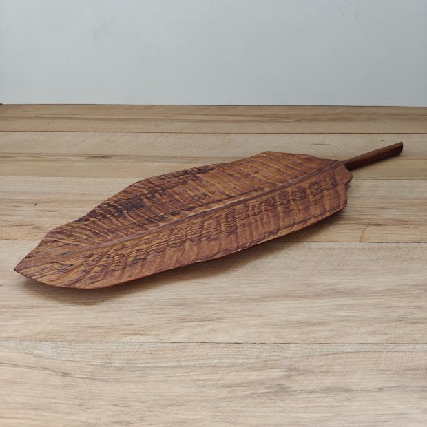 Paradise Leaf Platter draws its form from the Bird of Paradise leaf outside my workshop—a shape I pass daily that felt right for this piece. Carved from reclaimed Rimu (560 mm × 180 mm), the platter retains the timber's history rather than hiding it. Old nail holes, grain variations, and surface changes from its previous life remain visible, giving each piece individual character that can't be replicated. The carving follows the leaf's natural lines while working with what the wood offers. Where the grain shifts or old marks appear, the form adapts. Tung oil and beeswax provide a food-safe finish that enhances the timber's warmth without concealing its story. It works equally well holding food or standing alone—practical enough for the table, distinctive enough to display. The reclaimed timber reflects my preference for giving materials a second purpose rather than starting fresh. This approach—letting natural forms guide the design while respecting the wood's past—connects the finished piece to both its origins in the forest and its years in service before reaching my workshop. The result is straightforward in function but carries more depth than it first reveals.