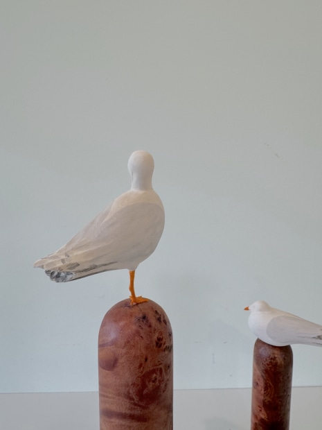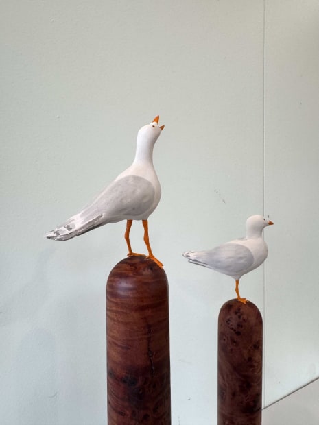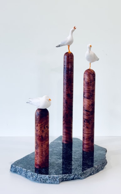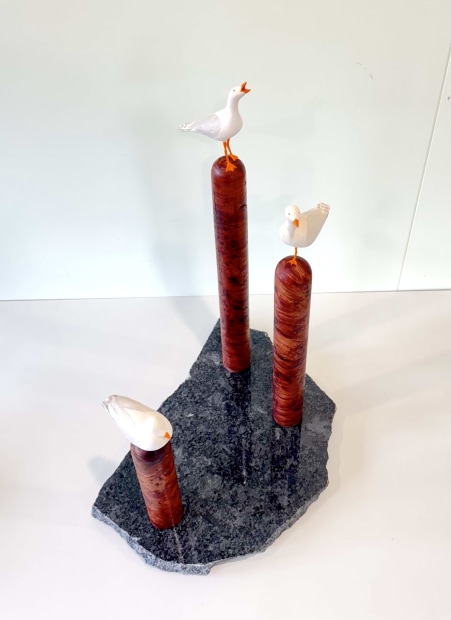 Rising Tides is a freestanding timber sculpture reflecting on climate change and rising sea levels. Three seagulls, hand-carved from offcuts of Huon pine with a knife, perch on pier posts turned from richly coloured myrtle burl. The gulls call out in varying states of agitation, alarm and disengagement, their cries echoing the uneasy relationship between the natural world and human impact. The choice of timbers was deliberate: the deep, rugged character of myrtle burl suggests erosion and resilience, while the pale softness of Huon pine carries the fragility of life at the water’s edge. This was my first experience turning burl — the first 2 posts turned like butter and the third post did test me! I am also unfamiliar with handheld knife carving work (I much prefer clamping my work and using traditional carving gouges) so this was an enjoyable exercise to test a new technique. At 47cm tall, Rising Tides is both playful and reflective, inviting the viewer to pause, listen, and consider the shifting balance of our coastal environments.