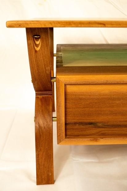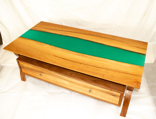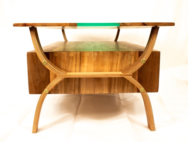 Resin river coffee table top made from reclaimed eucalypt slab. NZ Beech drawer box made with dovetails and Brush Box accents. Bent laminated legs made with alternating strips of NZ Beech and Brush Box.