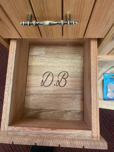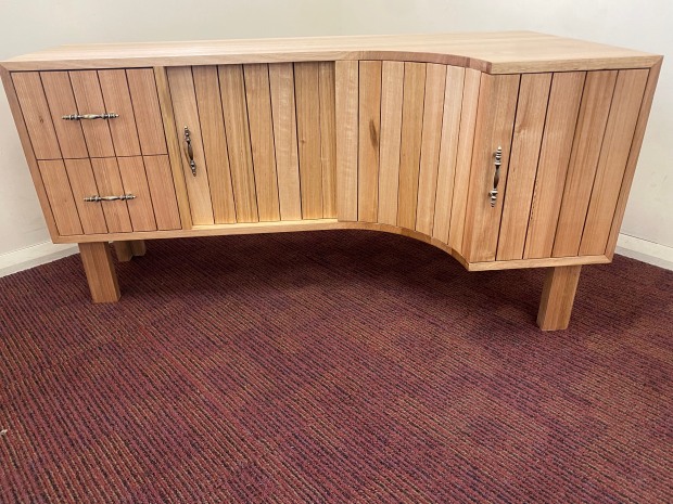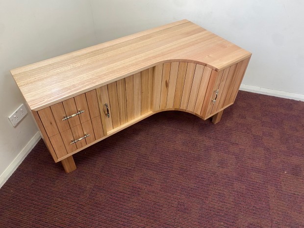 This project is a custom-designed Tasmanian oak corner unit, carefully crafted to balance aesthetics, function, and structural durability. The standout feature is the 90-degree concave curve that guides a sliding tambour door, softening the cabinet’s overall form while providing smooth and practical access to internal storage. The build incorporated a wide range of advanced joinery techniques. Dovetail joints were used to construct strong, precise drawers, mitre joints formed seamless edges in the carcass, tongue and groove extended the side panels with accuracy, rebate joints provided tracks for the sliding door; and mortise and tenon joinery, supported by domino joinery, secured the laminated legs for stability and strength. Additional features included a mitred edge on the cabinet door, grooves in the drawers for bases and router cut grooves for the runners providing smooth drawer function, as well as inlay cut for the unit’s back panel. The drawers were enhanced with custom laser-engraved inserts featuring the initials of my parents, adding a personal and sentimental element to the piece. The finishing process was equally meticulous: each surface was sanded progressively through 120, 180, and 240 grits with a Festool sander, ensuring a smooth, professional result. To protect and enrich the timber, multiple coats of Feast Watson wipe-on poly were applied, followed by Feast Watson soft wax on the tambour door tracks and drawer runners for effortless operation. The final product showcases refined craftsmanship, functional design, and meaningful personalisation, resulting in a unique, high-quality piece of furniture that reflects both technical ability and creative vision.