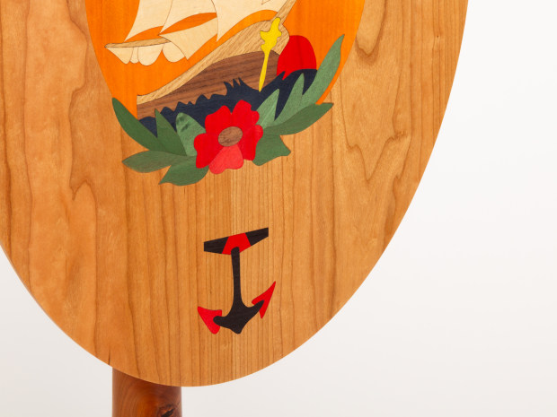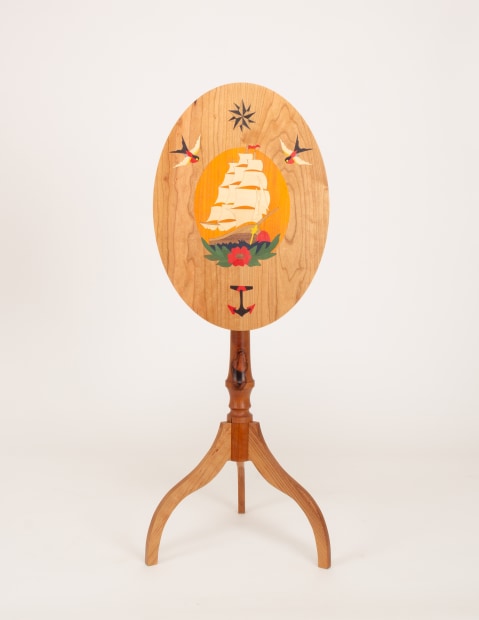 A tilt top table made primarily out of cherry. The top has inlayed marquetry of images that pay homage to early American/Sailor tattoos by artist like Sailor Jerry and Ed Hardy.