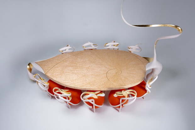 The Alchemist’s table is an exploration into magic, wonder and transformation. The customers brief was for a magic dining table for 9 people, based around the Fibonacci spiral, without a place of power ie no “head of the table” This is by far the most ambitious project I’ve ever undertaken. It involved pretty much every technique in furniture making I have in my quiver, steam-bending, laminating, marquetry, hand shaping, hand-cut joinery, turning, gilding and various finishing techniques. The front leg, inspired by a bowing ballerina, invites us to the table, formed around a golden Fibonacci spiral, the center of which gives birth to a starburst of stunning masur birch. Spiralling up from the voluptuous rococo-esque back leg a ribbon of gold and ash finds its way to the light from a window in the apex of the room. I designed the chairs after I’d come up with the table. Somewhat reminiscent of some kind of celestial body or perhaps a cauldron, these were probably the most challenging to make. Each one has 4 steam bent and laminated components which are then carved by both power and hand tools, before aligning perfectly around a hollow wooden sphere to create a surprisingly comfortable chair. The piece is made in locally sourced Norwegian ash (freshly cut from a few different sawmills)with a bleached finish, masur birch veneers, and gold leaf. Upholstery is in a fabric from Norwegian wool. I’m incredibly grateful to the customers for entrusting me with this wonderful commission.
