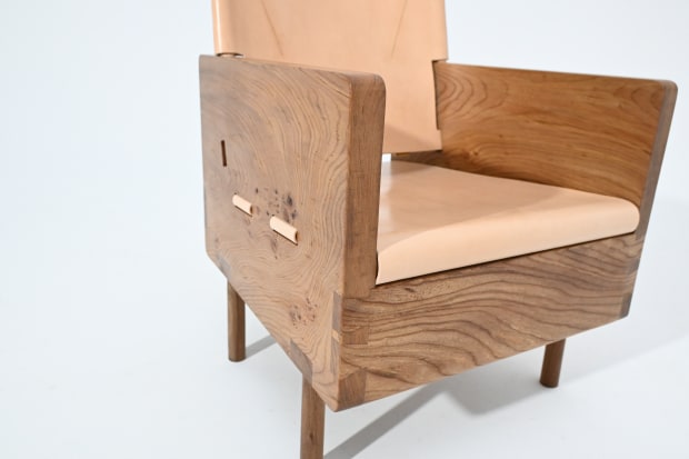 The Bare Lounge Chair has been designed to use the smallest number of inputs to develop a sustainable and functional lounge chair that shows a design response to current environmental considerations. The chair uses no glue and is constructed using timber threads and dovetail joints so the chair can be assembled easily when required or unscrewed for a small footprint for transport and storage. The backrest is hand stitched locally sourced saddlery leather, a byproduct of the meat industry and has been tanned in vegetable oil. The timber used has been sourced from end-of-life hardwoods that date back to early plantings in New Zealand circa 1860. Currently where I live local Councils management of these trees is to mulch all of these tree on removal because it is fast. I have designed this chair to show the value and beauty that can be obtained when these trees are managed as a resource and not a waste product, giving the tree a second material life. The main part of the tree has been source from a wind thrown Elm tree on walnut legs and maple backrest spindles. These two timbers have been used as they cut cleanly for the threads that allow the chair to unscrew. These threads have been lubricated with lanolin oil a natural product of NZ wool industry Finished in naturally derived oils and waxes containing no VOCS. Biogenic carbon content: 37.8 kg CO2