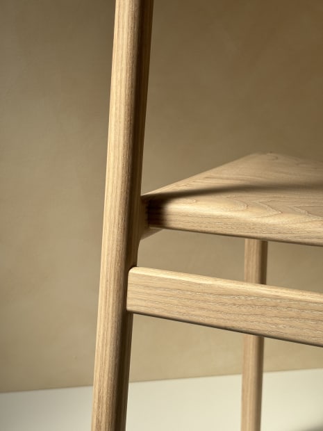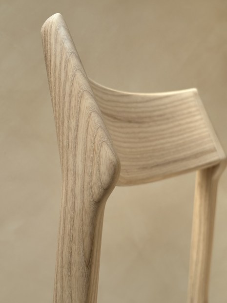 A contemporary dining chair made from English Ash. It features a deep, curved backrest and scooped seat that offer ergonomic support while keeping the overall silhouette and clean and minimal.