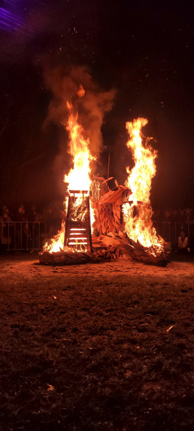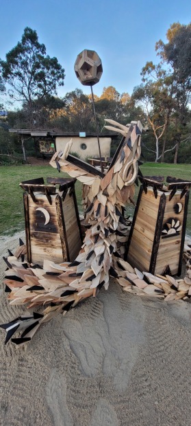 Built from 100% recycled materials including pallets and whiskey barrel staves. The Messenger weaves between the towers of life, death and rebirth seeking to consume the escaping ego of humanity. Built and burned for CERES winter solstice 2025.