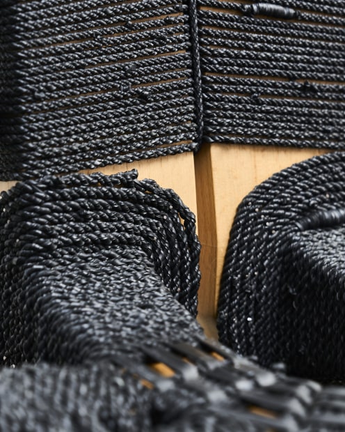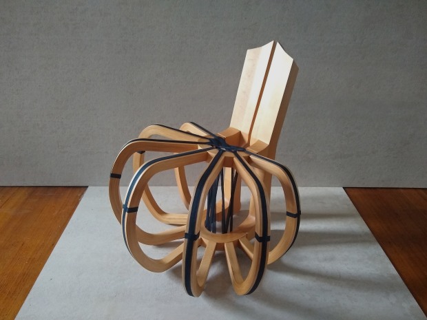 Originally built in 2022, this chair frame made from European Beech is repurposed and transformed using upholstery. The upholstery for Waka is made from discarded rubber bicycle inner tubes sourced from local bike shops that would otherwise end up in landfills. The rubber tyres are broken down into strips using analogue tools and machines of my own invention and then hand-woven into a pliable and durable rope. The rope is wrapped and woven through the chair's timber frame.