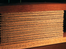 Each veneer is pressed between alternating corrugated cardboard sheets and clamped or weighted down inside the secondary box. Thanks to the large amount of surface area in contact with the veneers, combined with the constant airflow, this method allows the thin material, which would normally warp under such fast drying conditions, to stay remarkably flat and usable.